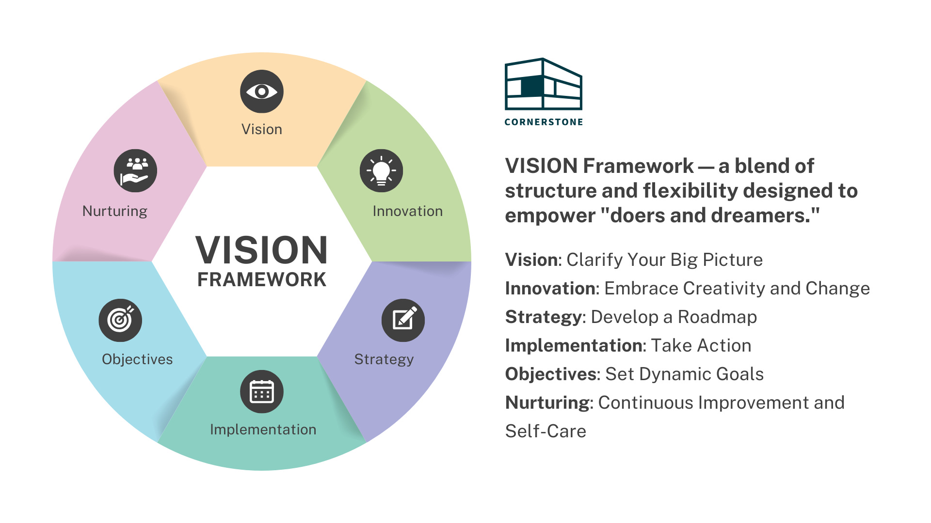 Meet the VISION Framework—a blend of structure and flexibility designed to empower "doers and dreamers." This framework emphasises Vision, Innovation, Strategy, Implementation, Objectives, and Nurturing.